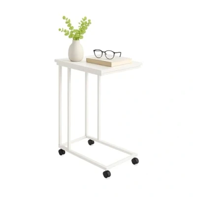 AmazonStorage: C-table for books, decor, snacks, and more. - Features wheels for easy movement Appearance: White side table with a stable MDF top and metal frame – modern design Design: C-shaped side table – conveniently slides under the bed or sofa for space-saving. Versatile: Ideal side table next to the sofa in the living room – also works as a bedside table. Details: Table dimensions HxWxD: 68 x 50 x 35 cm - Max load: 40 kg - Usable without wheels