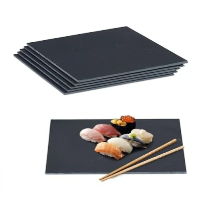 AmazonServing: Serve snacks, appetisers or desserts in style with these rectangular slate serving plates 6 pieces: This decorative sushi serving set consists of 6 slate slabs - Perfect for parties etc. Write on: Dessert plates can be decorated with names and more - Use chalk to write on platters Versatile: Use the stone platters for serving sushi and cheese or as decorative coasters for candles Practical: Serving boards made of slate W x D: approx. 40 x 30 cm - With non-slip felt pads