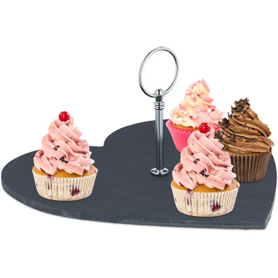 General description Impress your guests when you serve delicious food with this decorative slate platter. The romantic heart shape makes the serving plate ideal for special occasions, such as weddings, Valentine's Day, or birthdays. Present sushi, cheese, desserts, or chocolates in a visually appealing way on the slate dish, which is crafted from natural stone, adding a unique touch to any table. The silver metal handle allows for easy carrying. Technical specifications Dimensions: approx. 13 x 25 x 25 cm Thickness of the slate: approx. 7 mm Weight: approx. 0.8 kg Material: Slate, metal Colour: Black, silver Usage Ideal for serving starters, snacks, desserts, and more Easy to clean by hand with washing up liquid Includes felt pads to prevent scratches on the table Other information Please note: Slate is a natural product, and break-off edges may vary.