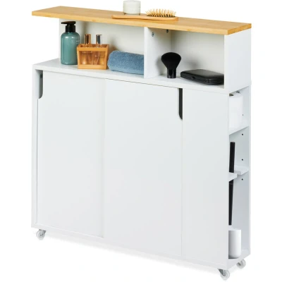 Relaxdays Slim Rolling Cart, Toilet Brush Holder, 79x17x75 cm, Bathroom Storage Trolley, MDF, Bamboo, White/Natural, Fibreboard, Plastic