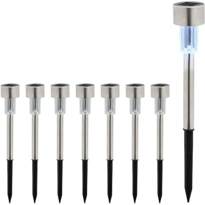 Create atmospheric garden lighting with these path lights in a handy set. Whether on the patio, in your flower beds or along a walkway, the LED solar lights can be placed in a variety of ways. During the day, the garden lights recharge in the sunlight and then switch on automatically at dusk thanks to the twilight sensor. They're sure to impress guests at your next summer garden party. Thanks to the ground spike, the solar garden lamps can be quickly secured in the ground. Solar Lights in Detail - Size H x D: approx. 31 x 4.5 cm - Ground stake length: approx. 12 cm - Weight: approx. 50 g each - Material: Stainless steel, plastic - Colour: Silver, black Further Information About the Garden Lights - Brightness: 6500K lumen - IP rating: IP44 - Protection class: III - Charging time: approx. 4-5 h - Illumination time: approx. 6-10 h Decorative Solar Lights for the Garden - Lighting for your patio, walkway, driveway, garden and more - Cool white lamps charge themselves via sunlight - Thanks