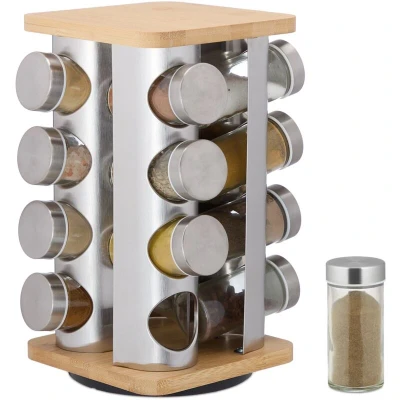 Relaxdays Spice Carousel, 16 Jars, 360 Rotating, Stainless Steel, Bamboo, Glass, HxWxD: 28 x 20 cm, Silver/Natural