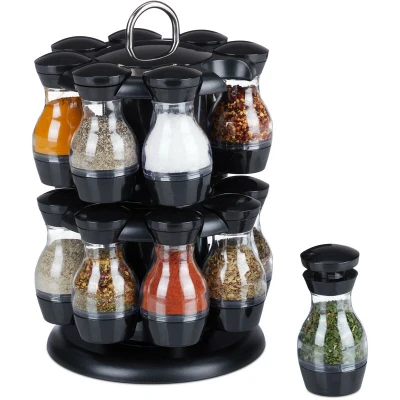 Relaxdays Spice Carousel, 16 Transparent Herb Jars, Rack 360 Rotatable, HxØ: 29 x 19 cm, Made of Plastic, Black/Silver
