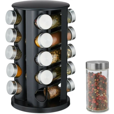 Relaxdays Spice Carousel, 20 Jars, 80ml Each, 360 Rotating, Stainless Steel, Glass, HxØ: 34.5x22cm, Counter Rack, Black, 34.5 x 22 cm