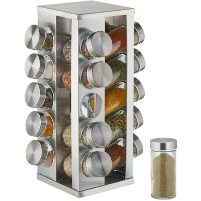 Relaxdays Spice Rack, 20 Glass Jars, Rotatable, Stainless Steel, H x D: approx. 33 cm, Silver