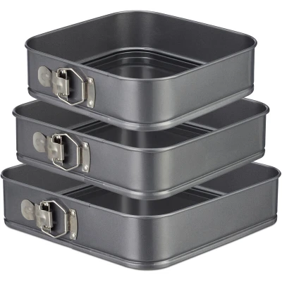 General description You can enjoy baking creative and unusual cakes with the Relaxdays Springform Square Set of 3. This set is perfect for making tiered cakes or several different cakes at once. The square shape of the cake pans is ideal for brownies, pies, pound cakes, and much more. With the nonstick coating, there's no need to pound the cake from the tin; simply open the clamp on the side to release your baked goods. Technical specifications Small cake pan size: H x W x D: approx. 7 x 24 x 24 cm Medium cake pan size: H x W x D: approx. 7 x 26 x 26 cm Large cake pan size: H x W x D: approx. 7 x 28 x 28 cm Total weight: approx. 1.1 kg Material: Carbon steel Colour: Anthracite Other information Included in delivery: 3x Springform Pan Square Decorative items not included