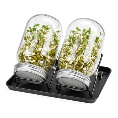 AmazonSet: Sprouting jar set with 2 jars, a rack, and a black drip tray - each jar approx. 850 ml capacity Sprout cultivation: Easily grow your own sprouts with sprouting jars – ensures optimal conditions Simple to use: soak seeds in the jars - rinse several times daily and drain the water. Design: The slanted design of the sprouting jars ensures drainage, keeping sprouts fresh longer. Healthy: Sprouting jars for a healthy diet – sprouts high in vitamins and minerals