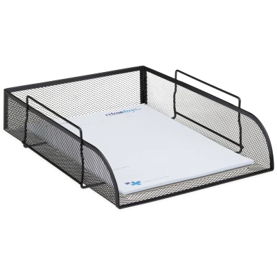 This handy metal document holder keeps all your most important files, letters and bills stacked in an orderly fashion. The storage compartment is suitable for DIN A4 format. The spacious compartment is made of thin wire mesh and features an eye-catching design that matches any desk! A corrugated surface ensures that you’ll have particularly good access to your files. Get your desk in order with this lovely filing cabinet. Stackable Document Sorter Details - Size H x W x D: approx. 8.5 x 26 x 33.5 cm - Internal size H x W x D: approx. 6.5 x 25.5 x 33 cm - Weight: approx. 360 g - Material: Metal Handy Filing Cabinet - Suitable for sheets and folders up to DIN A4 - Organizer for office, study or children’s rooms - Store documents and save space - For a quick overview of current tasks - All your files easily accessible - Metal mesh (in colour of your choice) Included in Delivery - 1 Metal document holder - Decorative items shown in product photos are not included