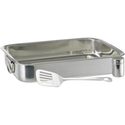 Relaxdays Stainless steel roaster set with spatula and cheese watering can, silver, 7 x 38 27 cm