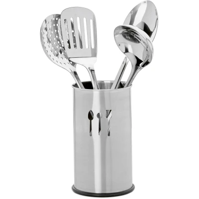 Amazon Marketplace5-piece set: Kitchen utensil set with spatula, ladle, slotted spoon, serving spoon and holder Stainless steel: The cooking utensils are high-quality and extremely robust - rust-proof and dishwasher safe Practical kitchen helpers: Use the utensils for baking, frying, cooking, preparing and serving - Handles approx 20 cm long and with hole for hanging Container: Round kitchen utensil holder with holes in the bottom - After washing, wet utensils can be air-dried in the holder - HxD: ca 17.5 x 10.5 cm Modern design: Shiny metal - Holder made of brushed steel with original motif in the shape kitchen utensils
