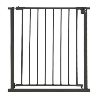 AmazonSafety: Door gate designed to protect babies, toddlers up to 24 months, and dogs at home Clamps: Black child safety gate for doors, passages or stairways 75–80 cm wide without extension Practical: stair gate with one-handed operation - opens and closes from either side Assembly: Stair gate with 4 screws - For secure installation, refer to the included instructions Details: Sturdy iron clamp gate - Height: approx. 76 cm - Safety gate meets EN 1930:2011