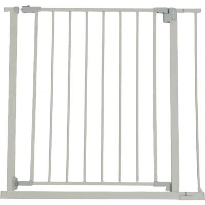 AmazonSafety: Door gate for protecting babies, toddlers under 24 months, and dogs at home Clamps: Grey child safety gate for doorways, passages or stairways 82 to 87 cm, extension included Practical: stair gate with one-handed operation – opens and closes from either side Assembly: Stair gate with 4 screws - For secure installation, please follow the included guide. Details: Sturdy clamp gate made of iron - Height: approx. 76 cm - Compliant with EN 1930:2011