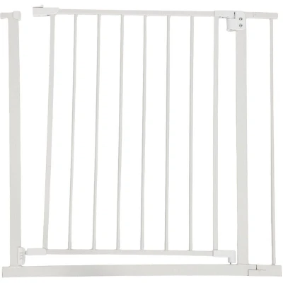 General description Protect your toddler from stairs and other hazards with this reliable safety gate designed for door frames, stair posts, and passageways. The stair gate fits openings measuring 75–80 cm and is installed using clamp screws, eliminating the need for drilling. For wider openings, you can use the gate extension for an additional 7 or 20 cm of space. This gate swings both ways and can be easily opened and closed with one hand, even while holding a baby. Technical specifications Height: 76 cm Width without extension: approx. 75–80 cm Width with 7 cm extension: approx. 82–87 cm Width with 20 cm extension: approx. 95–100 cm Material thickness (depth): approx. 1 cm Material: metal, plastic Other information Clampable safety gate for children and pets Ideal for securing specific areas and stairs Protects children up to 24 months from falls and other dangers Quick and damage-free installation using clamp screws Gate extension available for various door and staircase widths