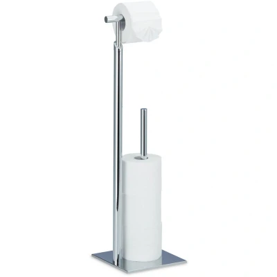 General description With the Relaxdays Standing Toilet Paper Holder, you will always have a roll within reach. This stylish and functional holder features an open design for easy access to tissues and can store up to 4 extra rolls on its vertical spindle. Its slim profile allows it to fit discreetly into your bathroom while keeping it organized. The lightweight construction makes it easy to move and assemble. Technical specifications Dimensions: approx. 71 x 20 x 20 cm Height of roll holder: approx. 68 cm Length of spare roll holder: approx. 42.5 cm Weight: approx. 1.8 kg Material: Silver chromed steel with a plastic base underside Installation Easy assembly with included instructions and materials Usage Holds 1 roll for immediate use and stores up to 4 spare rolls Open roll holder allows for simple removal of toilet paper Sturdy base ensures stability Other information Decorative items not included