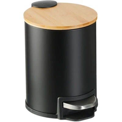 Relaxdays Step Pedal Bin, 3 Litre, Soft close Mechanism, Removable Inside, Bathroom Cosmetic Waste, Metal, Bamboo, Black, Iron, 22.5 x 17 23 cm