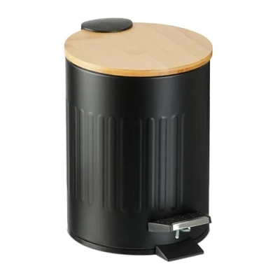AmazonUniversal: Round waste bin with 3 litre capacity for waste disposal in the bathroom and guest WC Design: Metal cosmetics bin in matt black - bamboo lid sets natural accents Soft close: Cosmetics bin with soft-close mechanism for slow and silent closing of the lid Hygienic: Bathroom bin with plastic inner bucket including handle - easy emptying of the contents Practical: Bathroom waste bin with pedal function for hands-free opening and closing of the lid