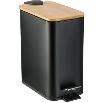 General description The Relaxdays Step Pedal Bin is a hygienic and convenient solution for waste disposal in the bathroom or at the dressing table. Its modern design features a decorative mix of matte iron and a natural bamboo lid, adding a stylish touch to your space. Technical specifications Dimensions (H x W x D): approx. 28.5 x 14.5 x 27 cm Inner dimensions of inner bin (H x W x D): approx. 23.5 x 11.5 x 21 cm Volume: approx. 5 litres Weight: approx. 1 kg Material: Iron, bamboo, plastic Usage Hygienic disposal of waste in the bathroom or at the dressing table Non-slip foot pedal allows for hands-free opening Removable inner bucket with handle for easy emptying Handle on the back for easy carrying