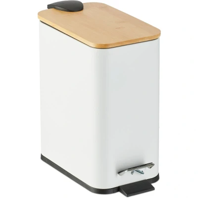 General description The Relaxdays Step Pedal Bin is a hygienic and convenient solution for waste disposal in your bathroom or at the dressing table. Its modern design features a decorative mix of matt iron and a natural bamboo lid, adding a stylish touch to your space. Technical specifications Dimensions (H x W x D): approx. 28.5 x 14.5 x 27 cm Inner dimensions of inner bin (H x W x D): approx. 23.5 x 11.5 x 21 cm Volume: approx. 5 litres Weight: approx. 1 kg Material: Iron, bamboo, plastic Usage Hygienic disposal of waste in the bathroom or at the dressing table Non-slip foot pedal allows for hands-free opening Removable inner bucket with handle for easy emptying Handle on the back for easy carrying
