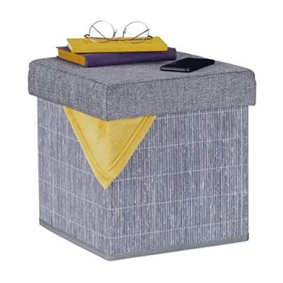 AmazonLarge: Storage stool with removable lid - Space for blankets, accessories, books etc. Upholstered: Comfortable fabric ottoman with thick foam padding - A comfortable seat Versatile: Perfect as a seat or footstool in front of the sofa - HxWxD: approx. 36 x 35 x 35 cm Decorative: Footstool made from bamboo in grey - Lid with grey linen-look cover Practical: Folding stool can be folded up and stored if you need more space