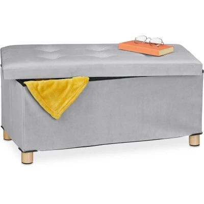 General description This fancy storage bench is ideal for storing your belongings while adding a touch of style to your living room or bedroom. It offers plenty of space for books, clothes, and more, making it a versatile piece of furniture. The cushioned velvet covering ensures comfort, making it perfect for seating or as a storage solution. Additionally, it can be easily folded up and stored away when not in use. Technical specifications Total dimensions (H x W x D): approx. 34 x 76 x 38 cm Inner dimensions (H x W x D): 25 x 72.5 x 34.5 cm Weight capacity: approx. 120 kg Weight: approx. 5.3 kg Material: MDF, Velvet, Foam, Wood Other information Available in various colours Included in delivery: 1x storage bench, 4x wooden feet (decorative items not included)