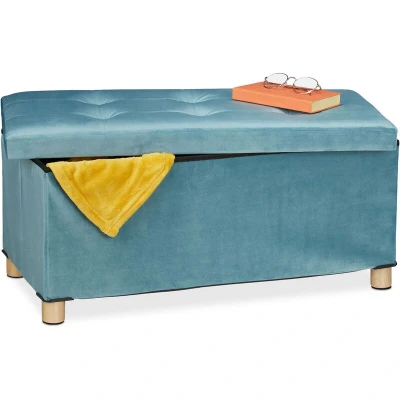 AmazonDecorative: The elegant design of the velvet bench fits into any interior - turquoise colour Practical: Bench with lid offers plenty of space for storing toys, blankets and much more Comfortable: Soft upholstery with a velvet cover gives bench an extra measure of comfort Foldable: This bench is quickly assembled and can folded again to save space when needed Basics: Storage bench, H x W x D: approx. 34 x 76 x 38 cm - Load capacity: approx. 120 kg