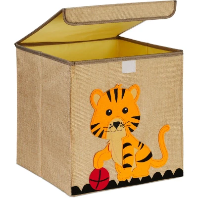 General description This cute toy box features a lovely tiger print design, making tidying up easier for your little ones. It is perfect for storing toys such as building blocks, soft toys, and children's books in the nursery or children's room. The box folds flat for easy storage when not in use, and the lid protects the contents from dust. Technical specifications Overall dimensions (H x W x D): 33 x 33 x 33 cm Interior dimensions (H x W x D): 32 x 32 x 31 cm Volume: 30 litres Max. load: 8 kg Weight: 0.7 kg Material: linen, cotton, paper Other information Various design options available Sturdy fabric storage basket with a great linen look Child-friendly design suitable for both boys and girls Convenient lid protects contents from dust Folds together to save space when not in use