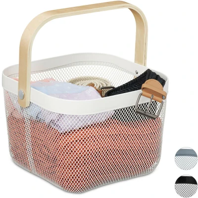 Amazon MarketplacePractical: The storage basket offers storage space for all kinds of objects - In plain white Flexible: All-purpose basket is versatile in living room, bedroom, study, office, kitchen etc. Basics: Spacious metal basket in lattice look with wooden handle - Size HBT: approx. 17.5 x 26 x 24.5 For tidiness: Use the wire basket to neatly store small items on the shelf, in the cupboard or on the table Use: Square utensil basket stores clothes, cosmetics, decoration, packaged food, etc