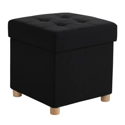 Storage space: Storage stool with lid – ample room for blankets, accessories, books and more. Design: Square fabric stool in black linen look with wooden legs – decorative eye-catcher Upholstered: Comfortable storage stool with soft foam padding – for a cozy seating experience Versatile: Can be used as extra seating, a footstool in front of the sofa, or a side table Details: Seat cube dimensions HxWxD: approx. 38 x 38 x 38 cm - The stool can support up to 300 kg.