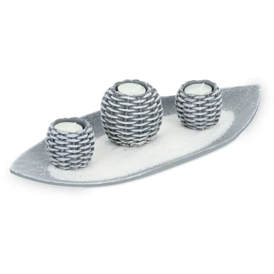 General description Create a cosy atmosphere in your home with this shabby chic tea light holder set. This stylish candle tray features 3 tea light holders in a woven look, making it perfect as a table decoration for your dining or living room table, or as an eye-catching addition to your windowsill or chest of drawers. The simple colours enhance its versatility, allowing it to look great whether used as a decorative set or as individual candles scattered around the room. Technical specifications Overall dimensions (H x W x D): approx. 7.5 x 39 x 16 cm Decorative bowl dimensions (H x W x D): approx. 4 x 39 x 16 cm Large tea light holder dimensions (H x D): approx. 7.5 x 8 cm Small tea light holder dimensions (H x D): approx. 5 x 6 cm Weight without sand: approx. 0.6 kg Material: MDF, sand, real wax, polyresin Colour: Grey, white Included in delivery 1x decorative tray 3x tea light holders 3x tea lights 1x bag of sand Decorative items are not included