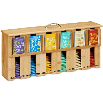 General description The Relaxdays Tea Organiser is a stylish bamboo tea bag box designed to keep your tea collection neatly organized. With 6 compartments, it allows for easy access and storage of different types of tea, making it a practical addition to any kitchen. Technical specifications Overall dimensions (H x W x D): approx. 22 x 46.5 x 10.5 cm Internal dimensions per compartment (H x W x D): approx. 17.5 x 7 x 8 cm Weight: approx. 1.5 kg Material: Bamboo, zinc Colour: Natural, silver Usage Each compartment holds up to 40 tea bags, allowing for ample storage. The removable lid facilitates easy refilling and access to your tea bags. Dividers help keep track of different tea types, preventing chaos in drawers. The decorative design makes it an attractive piece for your countertop.