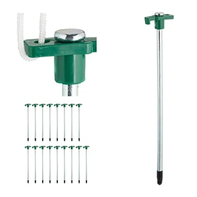 AmazonIn a set: 18 green tent pegs to securaly anchor tens, gazebos or marquees in the ground Fastening: The hook and hole of each peg allows for secure attachment of ropes and awnings Stormproof: These strong tent pegs protect your tents, gazebos or marquees from blowing over in wind To hammer in: The nails can easily be hammered into the ground due to their pointy tip Reliable: The 25 cm long pegs are made from robust stainless steel and do not bend