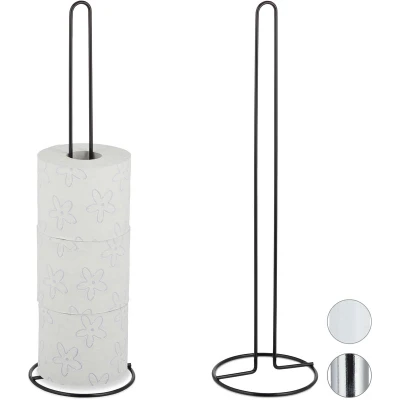 AmazonSet: 2 Stand for your toilet paper - Lovely set for main and spare bathrooms Easy to use: Spare paper roll holder in black- Can be freely combined - Subtle design Space-saving: Handy rail for 5 rolls of toilet paper - H x D: app. 50 x 14 cm Standing: Open stand for easy retrieval and refilling - For anywhere in your bathroom No drilling: Standing metal toilet paper stand - No assembly needed - Ideal for moist environments