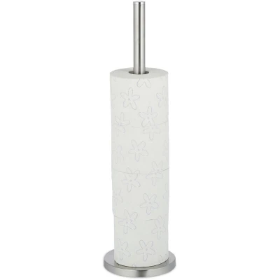 AmazonSpace-saving: Handy rail for 5 rolls of toilet paper - H x D: app. 55 x 15 cm Standing: Open stand for easy retrieval and refilling - For anywhere in your bathroom Sturdy: Heavy base for firm footing - Floor protectors effectively prevent scratches Elegant: Spare paper roll holder is matt silver - Can be freely combined - Subtle design No drilling: Standing metal toilet paper stand - No assembly needed - Ideal for moist environments
