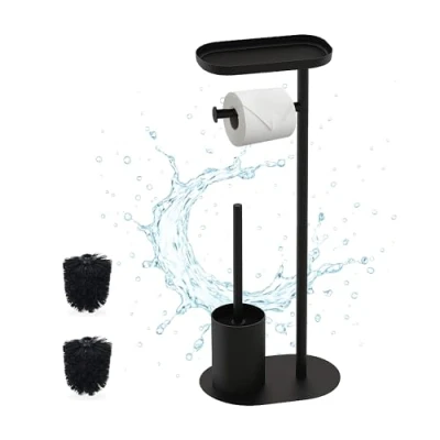 Amazon3 in 1: Practical combination of toilet paper holder, toilet brush and shelf for smartphones, etc. Design: Black toilet paper holder made of durable metal – complements various bathroom styles Hygienic: Removable brush holder for easy cleaning - includes 2 replacement brush heads Stable: Toilet set with heavy base for secure stand - foam protector to prevent scratches Details: Dimensions HxWxD: 65 x 23 x 17 cm - Brush head HxD: 9 x 8 cm - D thread: 1.1 cm