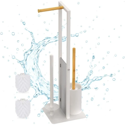 General description With this elegant toilet stand, you'll always have toilet paper, spare rolls, and the toilet brush within easy reach. Whether in the bathroom or guest WC, the freestanding toilet stand can be placed flexibly and does not need to be fixed to the wall. The decorative design in matte metal with bamboo accents makes the toilet set a striking feature in any bathroom. Technical specifications Dimensions (H x W x D): 65 x 21 x 18 cm Brush head dimensions (H x D): 10 x 8.5 cm Brush holder dimensions (H x W x D): 14.5 x 9.5 cm Spare roll holder dimensions (H x D): 31 x 2 cm Weight: approx. 1.3 kg Material: iron, bamboo, plastic Included in Delivery 1x toilet brush set in individual parts 2x replacement brush heads Instructions and assembly materials Decorative items are not included in the delivery Other information Hygienic replaceable brush head Removable toilet brush holder for easy cleaning Heavy base for stable standing Various colours available