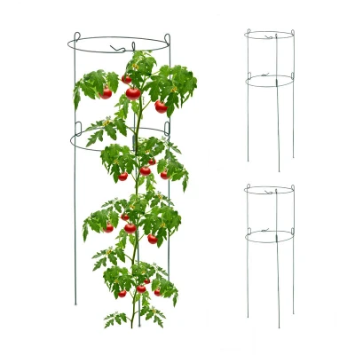 Relaxdays Tomato & Cucumber Creeper Set of 3, Metal, Round Plant Support, HxD: 76 x 26 cm, 2 Rings, Tower, Green, Steel, 76x26x26cm