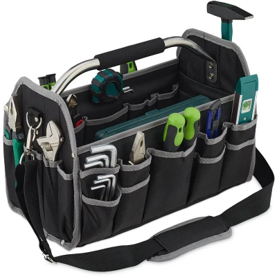 AmazonStorage space: Large inner compartment and many side pockets - offers space for all kinds of tools Overview: Open design of tool bag makes sure all hammers, screwdrivers etc. is easily accessbile Comfort: Craftsman bag with padded metal handle and adjustable, detachable shoulder strap Sturdy: Assembly bag made of robust 600D polyester fabric and stainless steel - with plastic feet Practical: Tool carrier as the ideal companion on construction site - HxWxD: approx. 30 x 42 x 23 cm