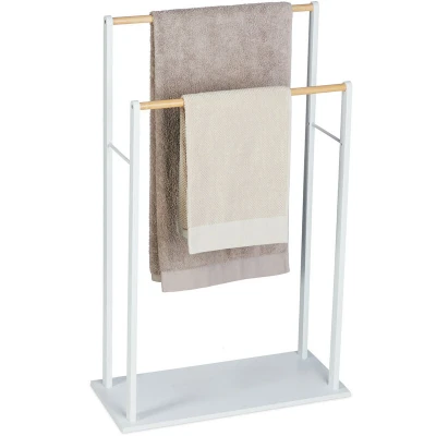 Relaxdays Towel Rack, 2 Bars, MDF & Bamboo, HWD: 91.5 x 57 25 cm, Free Standing, Bathroom Drying Rail, White/Natural, Fibreboard