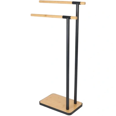 General description With this standing towel rack, you can dry your hand and bath towels in a space-saving manner. The bathroom stand features two bars and can be positioned freely in the room – no drilling required. Use the towel rack in your bathroom or guest WC. The bath towel holder is made from a combination of black steel and bamboo accents for a stylish look. Thanks to the heavy base and non-slip floor pads, the towel rack offers reliable stability. Technical specifications Dimensions H x W x D: approx. 81 x 39.5 x 20 cm Usable bar width: approx. 26 cm each Bar heights: approx. 80 cm and 72.5 cm Base plate W x D: approx. 30 x 20 cm Load capacity: max. 3 kg Weight: approx. 1.7 kg Material: Steel, bamboo Colour: Natural, black Usage Ideal for hanging towels, clothing, and more Practical for drying hand and bath towels