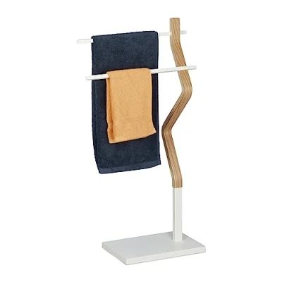 AmazonDesign: Decorative towel rail made of white lacquered metal and wood - With 2 staggered rungs Compact: The freestanding towel dryer is space-saving and can be positioned flexibly Versatile: Towel rack for bathroom - Tea towel holder for kitchen - Clothes butler for bedroom Material mix: Light wood tones combined with metal for a natural look - Loadable up to max. 2 kg Details: Dimensions stand towel rail HxWxD approx. 85 x 43.5 x 20 cm - Heavy base for stable stand