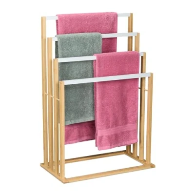 AmazonPractical: Towel rail with four offset rails ensures quick and easy drying thanks to air circulation Modern: Bathroom towel rack in a soft timeless design - Natural bamboo frame with white accents Versatile: Stand-up towel rail ideal for hanging and drying hand- or shower towels, clothes and more Free-standing: Towel rail for bathroom and guest WC - Base with rubber protectors against scratches Details: The shower towel holder HWD: approx. 82 x 55 x 31 cm - Easy installation without drilling