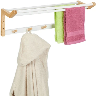 Relaxdays Towel Rail for The Wall, Mounted Bathroom Rack with Hooks & Bars, Bamboo, HxWxD: 22x60x20 cm, Natural/White