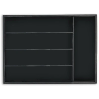 General description No more messy drawers with this cutlery rack. With 5 spacious compartments, there is plenty of room for cutlery, large kitchen knives, and various cooking utensils. This versatile cutlery organiser can also be used for writing utensils, craft supplies, and more. Crafted from sturdy bamboo and MDF, the cutlery tray features a practical matte black finish. Technical specifications Overall dimensions (H x W x D): approx. 4.5 x 34 x 25 cm 4 compartments inside (H x W x D): approx. 4 x 5.5 x 24.5 cm Large compartment inside (H x W x D): approx. 4 x 23.5 x 7.5 cm Weight: approx. 520 g Material: Bamboo, MDF Colour: Black Installation Make sure you measure your drawer exactly so that all you have to do is insert the box. Usage This cutlery organiser is perfect for creating order and clarity in your drawer. It can store cutlery, kitchen utensils, craft supplies, or office supplies. Other information Included in delivery: 1x cutlery tray. Decorative items are not included in