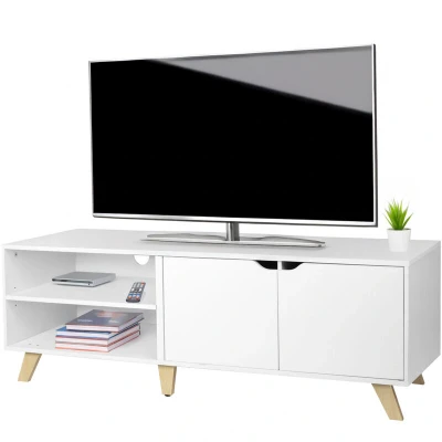 Amazon MarketplaceEntertainment: TV bench for film nights and gaming – white TV unit in Scandinavian style TV stand: Wide shelf for widescreen TVs - For up to 60" TV - HWD: 50x140x40 cm Organisation: TV unit with 2 open compartments - Adjustable shelf height - Cable holes Extras: TV cabinet with 4 closed compartments – 2 doors with handle holes & magnetic closures Details: TV unit in engineered wood - Supports approx. 80 kg - Stable with non-slip feet