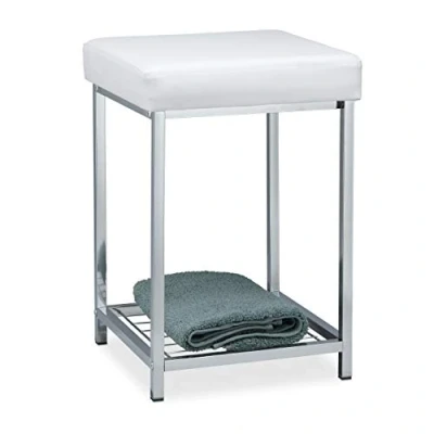 AmazonSeat: Square stool with a space-saving design - H x W: app. 47 x 33 cm - Fits in any corner Handy storage space: Includes one shelf to store newspapers, magazines and more Elegant design: Ottoman with a shiny frame made of chromed iron and a white cushion Comfortable: Small stool with an upholstered surface and a fake leather cover to sit comfortably Multifunctional: Suitable for the make up mirror, living room, bathroom or entrance