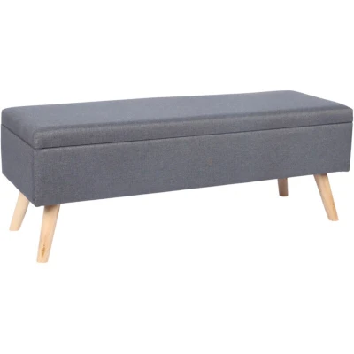 General description This stylish upholstered storage bench with a soft linen cover is a true highlight for your home. Whether used as a hallway bench, a sofa bench in the living room, or a bed bench in the bedroom, it enhances any space. The padded, foldable seat ensures comfort while concealing generous storage for laundry, blankets, or toys. Supported by four sturdy eucalyptus wood legs, this trunk bench combines stylish aesthetics with functional benefits. Technical specifications Overall dimensions (H x W x D): 40 x 110 x 40 cm Internal dimensions (H x W x D): 15 x 105 x 36 cm Ground clearance: 19 cm Max. load capacity: 120 kg Weight: 14.3 kg Material: MDF, eucalyptus wood, polyester Other information Various colours available Felt glides to protect the floor Delivery includes: 1x bench in parts, assembly instructions, and materials (decorative items not included)