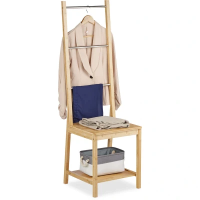 General description The Relaxdays Valet Chair is a practical clothes stand designed to keep your garments wrinkle-free while adding a touch of natural elegance to your home. This versatile piece features three rods and two shelves, providing ample space for trousers, tops, ties, and shoes. Additionally, the top shelf doubles as a seat, making it a functional addition to any hallway, dressing room, or bedroom. It can also serve as a towel rack in the bathroom, perfect for storing shower towels and cosmetics. Technical specifications Dimensions (H x W x D): 133 x 40 x 42 cm Seat dimensions (W x D): 40 x 37.5 cm Maximum weight capacity: 80 kg Lower shelf dimensions (W x D): 35.5 x 33 cm Lower shelf maximum weight: 15 kg Rungs width: 34.5 cm Maximum weight per rung: 3 kg Distance between rungs: 26 cm Weight: 5 kg Material: Bamboo, stainless steel Colour: Natural, black Usage This valet chair is ideal for organizing clothing items such as trousers, tops, ties, and shoes. It can also be