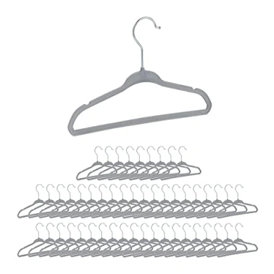 AmazonSet of 50: These hangers keep the wardrobe looking neat and tidy - in grey design Child-friendly: These simple hangers are the ideal size for baby clothes and children's clothes. Coated: Non-slip velvet coating and rounded edges for safety Versatile: Velvet hanger with notches for shirts, dresses, etc. - Hang trousers over the trouser bar Details: HWD: app. 18x28x0.5 cm - Pants bar W: app. 42 cm - With rotating hooks