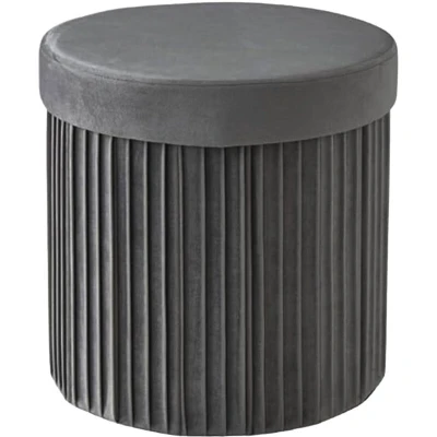AmazonStorage space: Upholstered stool with lid – Ample room for blankets, books, etc. – Size: 38 x 38 cm Design: Round stool with pleated velvet cover in dark grey – a stylish accent for your living space Upholstered: Comfortable storage stool with soft padding – for a delightful seating experience Versatile: Can be used as extra seating, footrest in front of the sofa or side stool Practical: fold the fabric stool when not in use and store it away to save space.