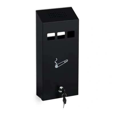 Practical: No more messy lying around cigarettes thanks to the wall ashtray - Ideal for outdoor use Cleaning: Open the door with the included key, remove the inner silver coloured ashtray and empty it Versatile: Ashtray for smoking area in front of the office, restaurants, bars and entrance area Design: Black metal ashtray with white cigarette pictogram - Easily recognisable as an ashtray Basics: Weatherproof iron cigarette ashtray - Dimensions HWD: 32.5x15x6 cm - With mounting material